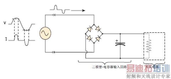 公共设施供应交流电压,然而,电子设备工作于直流电压。由电源完成交流至直流的变换。电源具有二极管桥电路,能将交流电流转变成平滑的直流电流,并接下来,给电容器充电。若负荷从电容吸取电荷,则重新对电容充电。然而,由于只有在波形出现峰值时,供电电压才大于电容自身电压,故,只有峰值电压才能对电容进行重充电过程。