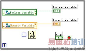 先输入变量库文件路径部署库,再循环写入布尔和数值到变量中,按stop中止程序。