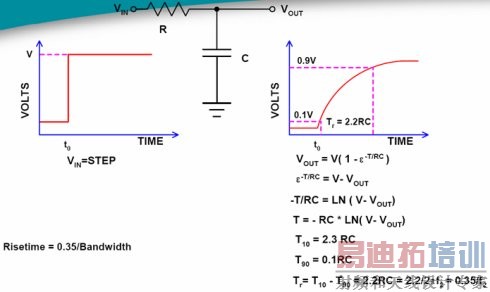 至此,我们知道带宽f2即输出电压降低到输入电压70.7%时的频率点。 根据放大器的等效模型,我们可进一步推导示波器的上升时间和带宽的关系式,即我们常提到的0.35的关系:上升时间=0.35/带宽,推导过程如下图6所示。 需要说明的是,0.35是基于高斯响应的理论值,实际测量系统中这个数值往往介于0.35-0.45之间。在示波器的datasheet上都会标明“上升时间”指标。 示波器测量出来的上升时间与真实的上升时间之间存在下面的关系式。在对快沿信号测试中,需要通过该关系式来修正实际被测信号的上升时间。