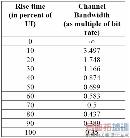 示波器的带宽>1.8 X信号比特率.在这个准则下,如果被测信号的上升时间>20%UI,那么1.8关系的带宽能捕获信号能量的99%. 下面的图表给出了不同的上升时间和带宽之间的关系。