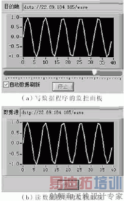 连接方式中的Publish和Subscribe方式为双向传输提供方便,两台计算机中的任何一台都可以控制另外一台计算机的控件数值。例如,要将本地波形显示器(Waveform Graph)的数据与网络中的其他计算机共享,可在本地波形显示器的DataSocket Connection属性对话框中指定URL,并选择Publish连接方式,异地波形显示器的DataSocket Connection对话框中URL应符合以下格式:dstp://servernamecom/waveformdata,其中servername com是本地计算机的网址,它可以是计算机名、IP地址或计算机域名:waveformdata是数据的名称标识(tag),用以区别不同的DataSocket连接。这样两异地控件就建立连接。运行两程序,当控件右上角的方框层绿色时,标明数据发送或接收得到正确连接,本地控件的数据就可实时地传动到异地控件中;当方框呈红色时,表明数据与DataSocket Server连接失败。