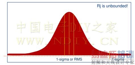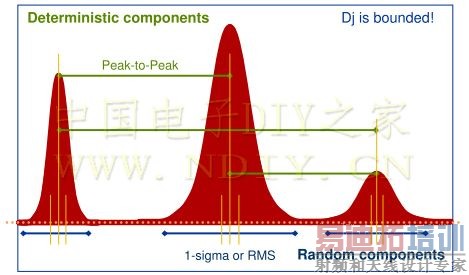 呈现高斯分布的抖动通常是由于热噪声等引起的,称为随机抖动(Random Jitter);呈现双峰且将高斯曲线分成两部分的双峰之间的抖动值称为固有抖动(Deterministic Jitter);通常来说抖动成分主要是由随机抖动Rj和固有抖动Dj构成的,在之前的第二节我们有介绍到由于Rj的峰峰值是