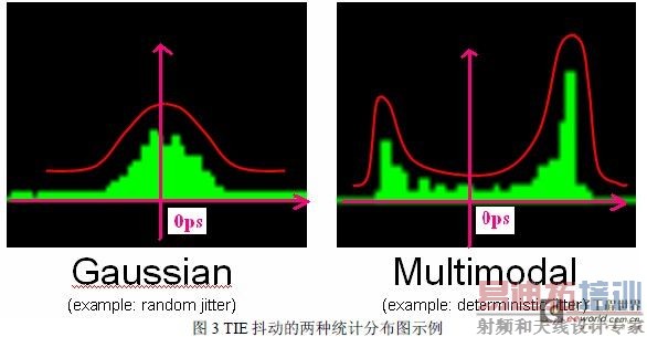 如果将所有边沿处的TIE抖动做一个直方图统计,我们可能会发现这些TIE值是具有一定的统计规律的,如下图所示分别为呈现高斯分布的TIE抖动以及呈现双峰分布的TIE抖动: