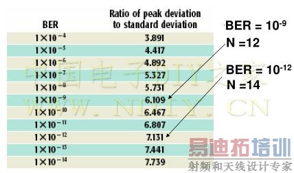 ****的,随着累积样本数的增加而增加,因此通常是用统计标准偏差值(几个sigma范围内的抖动值)来衡量的;而Dj则是用峰峰值来衡量的。当前大部分串行数据标准要求测量误码率为10e-12时的总体抖动(Tj)大小,而通常直方图+/-7 sigma以内的数据样本数才能达到10e+12。Tj就是衡量Dj与Rj的整体影响的抖动术语。误码率为10e-12时的总体抖动Tj=14Rj+Dj (Rj是指1sigma时的抖动或者叫RMS抖动;Dj是固有抖动的峰峰值)