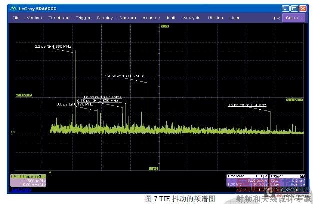 如果我们不用统计的方式来分析TIE抖动,而是在一个很长的时间轴上来看所有的TIE抖动值的变化趋势,即用如Lecroy示波器中的参数track的功能,我们也同样能够看出TIE抖动值的变化趋势: