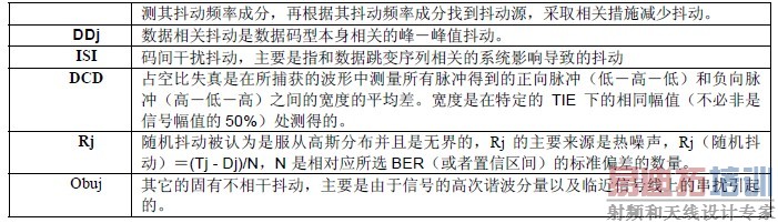 1、数据抖动是以TIE抖动作为基本单位展开分析的,根据抖动的构成成分,将一定误码率情况下(特定的样本数量)的总体抖动Tj分解为Dj,Rj,DDj,Pj等;因为数据信号不具备如时钟信号一样的周期重复性,因此数据信号没有周期抖动、相邻周期间抖动的指标。