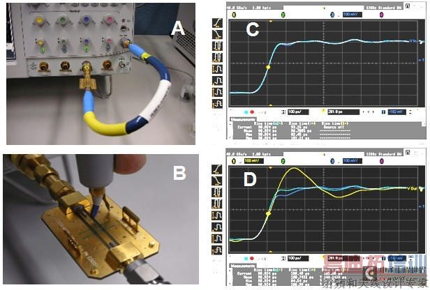 下图是实际验证的一个例子,图A把示波器的AUX OUT通过同轴电缆连接到测试夹具,测试夹具的另一端通过SMA-PBNC适配器连接到示波器的一个通道上(此例连接到通道3),把探头连接到通道1上,此时调整屏幕上的波形,使得出现一个边沿阶跃波形,如图C所示,并把此波形存为参考波形。如图B把被验证探头和附件点测到测试夹具上,如图D所示,屏幕上出现3个波形,兰色的是参考波形,绿色的是受探头影响后的被测波形,黄色的是探头显示的波形,通过测试上升时间参数,过冲参数等,可确认探头和探头附件的性能。