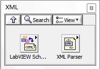 LabVIEW提供了两类处理XML文件的VIs,如图 18所示,依次为LabVIEW Schema和XML Parser。前者是将LabVIEW中产生的相关数据,如waveform、string、array、cluster等按照内置的XML Schema(XSD)文件产生符合XML验证的XML字符串;后者是使用XML DOM对象访问和解析XML文件。