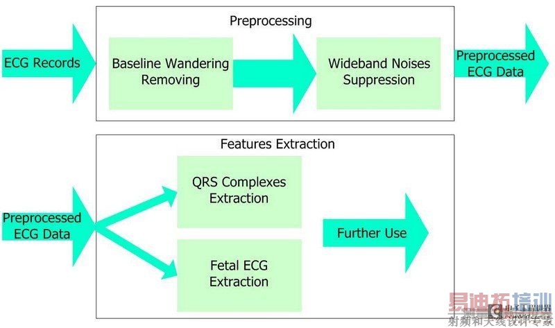从功能上来说,心电信号的处理可以大致分为两个阶段:预处理和特征提取(如图2所示)。预处理阶段消除和减少原始心电信号中的噪声,而特征提取阶段则从心电信号中提取诊断信息。