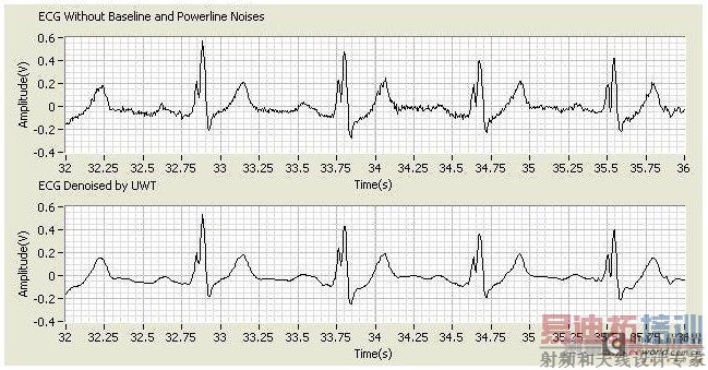 这种Express VI首先应用小波变换将心电信号分解到各个子带,然后利用阈值或收缩功能调整小波系数,最后重建出消除噪声后的信号。下图显示了对心电信号使用非抽样小波变换(UWT)的实例。 [p]