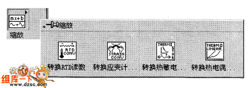 缩放子选板如图1所示,子选板中的节点用来将电压读数转换为温度或应变单位等。