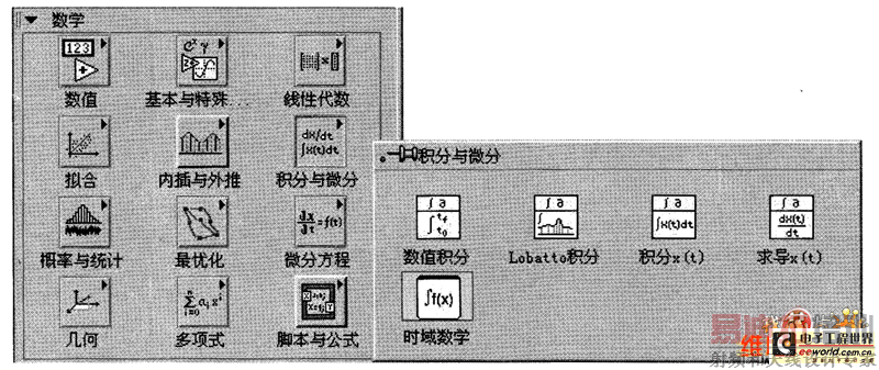 LabVIEW 8.2中数组的微积分运算节点位于函数选板的“数学→积分与微分”,如图所示。