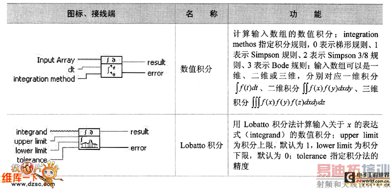 积分与微分子选板对输入的确定数组进行积分和微分运算。如表详细列出了积分与微分子选板中函数和Ⅵ节点的图标、接线端、名称和功能。