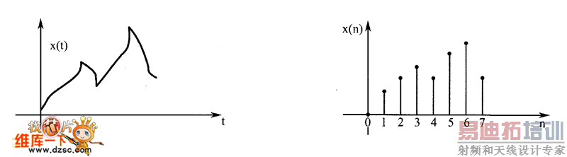 信号根据自变量(一般为时间)的连续性可分为连续信号和离散信号。如果信号的自变量是连续的时间变量,则该信号是连续信号:如果自变量是离散的时间变量,则该信号是离散信号。连续信号和离散信号的例子随处可见,例如电压波形是随时间而变的连续信号;指数是随时间而变的离散信号。信号值也分连续和离散两种情况。如果信号值和时间都是连续的,则信号为模拟信号,如果信号值和时间都是离散的,则信号为数字信号。如图中x(t)为模拟信号,x(n)为数字信号。