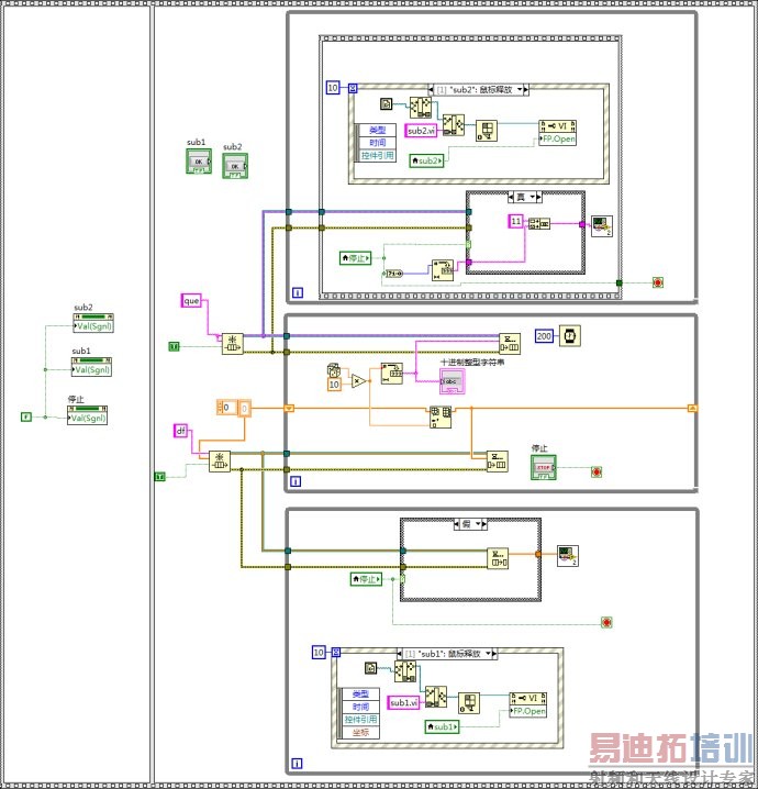 对于子Vi之间数据的传递以及相互控制还可以通过全局变量,以及通过Vi引用调用属性节点的方式可以获取其他Vi的控件的值,对于这部分本人知之甚少,而且用哪一种方法更有效率更可靠也未能深入研究,希望大家能发挥自己的主观能动性尝试更多更有效率的方法,并提出更多宝贵的意见,便于编出更完美的程序。