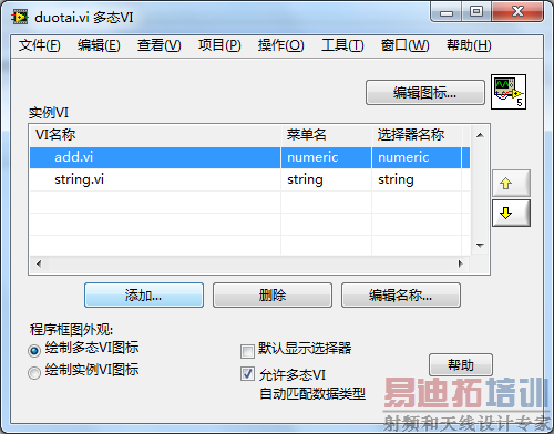 通过编辑名称按钮进行编辑,结果如上图所示。然后保存该多态VI。