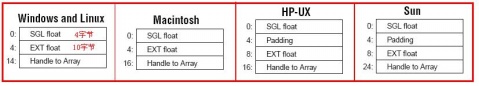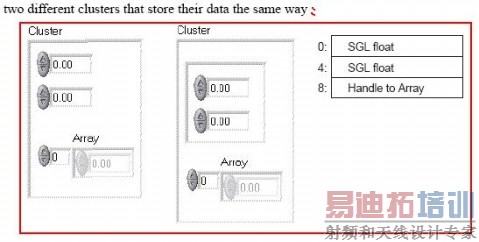 在内存中,簇直接存放标量数据(numeric)。对于数组、字符串或路径,簇只是存储这些数据类型的的首地址指针。不同操作平台(OS)在数据对齐有所差异,为确保存储数据的第一个元素对齐,可能需要往这个元素前添加一些字节数。下列图形显示一个簇(元素包括单精度浮点数、扩展精度浮点数和一个指向一维无符号字整型数组的首地址指针)在不同操作系统下的存储格式。