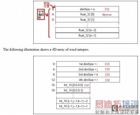 提示:为了正确对齐数字,在第一个数字前可能需要附加一些字节数。当句柄为0,则是空数组。下列两图分别描述一维单精度(SGL)浮点数组、四维字整数(I16)数组,左边的数字代表偏移(offset)数组在内存起始存储位置的字节数。
