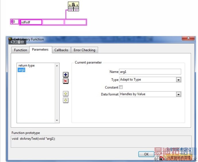 LabVIEW CLN调用dll时,接口只能是c99的类型,不可以使用c++的string类型。 int32 len; LStrHandle elm[1]; int arraySize = (*strArray)->len; LStrHandle h = (*strArray)->elm[0]; int curStrSize = LStrLen(*h); char *curStr = ( char *)LStrBuf(*h); int len = strlen(curStr);