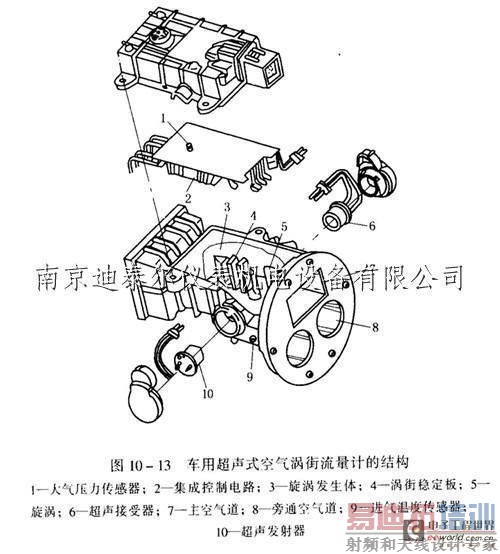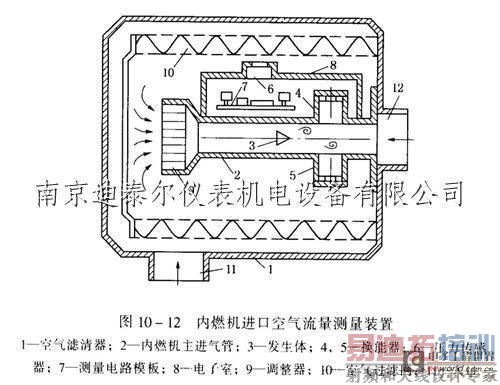 涡街流量计通常安装在空气滤清器与节气门一之间的进气管道上,也有的将它与空气滤清器外壳安装成一体,如图10一12是流量测量装置的结构示意图。在图中,旋涡发生体3垂直地安装在主进气管内,在发生体3的下游,安装了一对超声换能器4和5,其中4为发射换能器,5为接收换能器。主进气管外部是空气过滤网10,在主进气管2的前端部安装了一个蜂窝状的流动调整器9,对进人主管的气流进行整流,为流量测量提供较好的流动条件,从而弥补了发生体上游直管段长度的不足。压力传感器6安装在电子室8内,通过上面的窗口感测空气的压力。电子室8是紧贴进气管2安装的一个小空间,里面可安装压力传感器6和测量电路模板7。