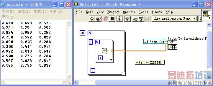 WRITE TO SPREAD SHEET FILE VI是个多态VI,输入可以是一维或者二维,类型可以是INTEGER 、DOUBLE数组或者字符串数组,从实质来说,它的输入是字符串数组,DOUBLE 或者INTEGER数组不过是它自动转换成字符串数组然后写入文本文件的.