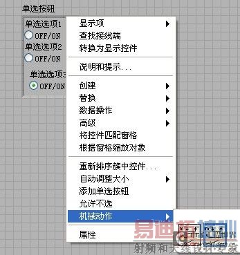 当选择“允许不选”时,0表示所有按钮均不选,1表示选择第一个按钮。LABVIEW中的单选按钮也可以选择机械动作。机械动作有两种选择,“单击时转换”和“释放时转换”。