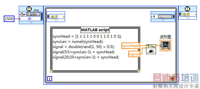 在信号生成部分,使用的同步序列是13位的巴克码。生成信号时,首先用0-1随机序列填充信号向量,然后随意插入了几个同步头序列。在整个信号处理的框图外面套了一个定时循环,这样就可以在scope上看到动态的波形图了。定时循环的时钟是1kHz,将计数器设为1500就可以让定时循环每1.5s触发一次。