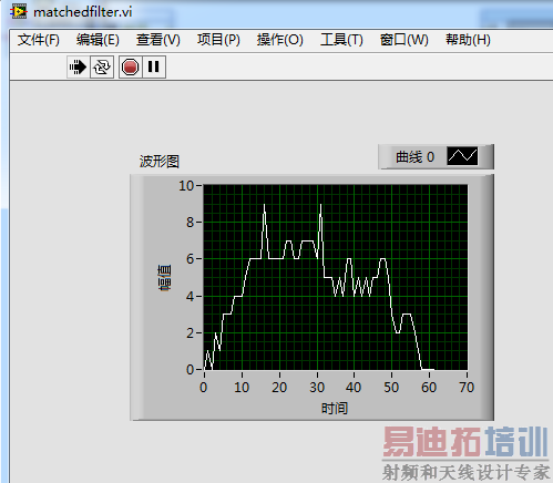 这次搭的框图异常简单,信号生成部分使用MATLAB节点,匹配滤波器使用LabVIEW提供的互相关节点,最后将输出接到一个Scope上,就完成了。主要就是三个部分:信号构造,信号处理,可视化。框图如下: