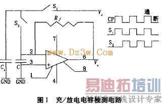 由CMOS开关S1,将未知电容Cx充电至Ve,再由第二个CMOS开关S2放电至电荷检测器。在一个信号充/放电周期内从Cx传输到检波器的电荷量Q=Ve·Cx,在时钟脉冲控制下,充/放电过程以频率f=1/T重复进行,因而平均电流Im=Ve·Cx·f,该电流被转换成电压并被平滑,最后给出一个直流输出电压 Vo=Rf·Im=Rf·Ve·Cx·f(Rf为检波器的反馈电阻) 。