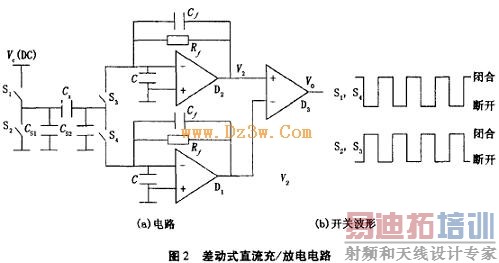 充/放电电容测量电路典型的例子为差动式直流充放电C/V转换电路,如图2所示。