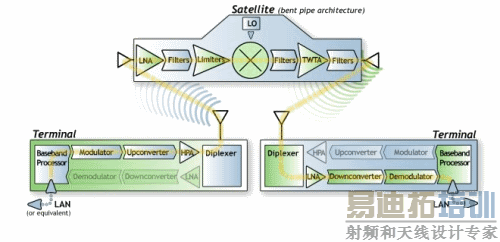 图1给出了传统“弯管”式卫星下行链路的整体示意图,它包括了主要的部件,但卫星部分只显示了一个转发器图像。实际上,一个卫星可能带有30到50个转发器。