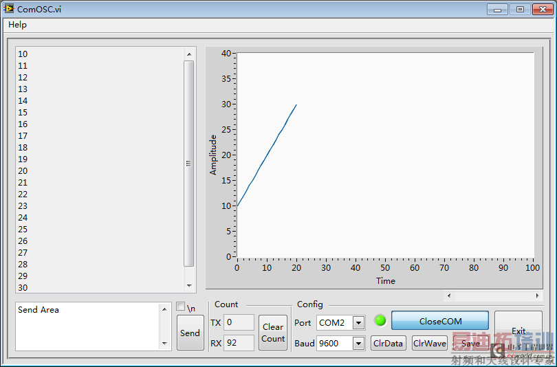 功能介绍:左边上方串口接收区,下方为串口字符发送区。右方为一个波形图表,在程序内部每次将串口发送过来的数据,以f%格式化,显示在波形图表上。