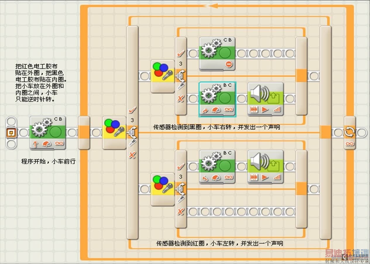 传感器检测到黑圈,小车右转,并发出一个声响;传感器检测到红圈,小车左转,并发出一个声响。这样小车用一个颜色传感器,就可以在黑圈和红圈之间,“蛇”行寻线了。
