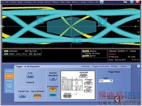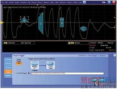 可视触发这种选配功能提供了一种直观的基于示波器格线形状的触发方法。通过这一功能,70000系列示波器用户可以定义图1示波器显示屏上显示的形状,作为进入信号的触发事件。