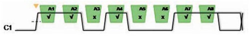 可视触发可以与上一篇博文中介绍的泰克Pinpoint触发系统结合使用,作为前面介绍的"A"事件的布尔逻辑限定符使用。通过使用最多8 种形状创建一串1 和0,仿真串行码型触发(参见图2),可视触发加快了高速串行信令的复杂调试工作。这变成了在可视触发中实现的串行码型触发,可以量身定制,支持示波器用户希望的任何可能数据速率或独特的编码方案。