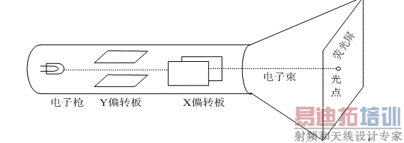 在一个封闭玻璃管显示屏的内壁涂上荧光粉,当荧光粉被大量电子形成的电子束轰击时,会发出荧光。可以发出电子束的设备称为电子*,它可以连续地发出集束性很强的电子。这些电子束在飞行过程中,如果遇到电场的作用,会因电场形成的力而改变运行方向,导致最终电子束落到荧光屏上的位置发生改变,也就是光点改变。根据这个原理制造的示波管,其结构如图2.1.2所示。图中电子*发出的电子束,经过两个偏转板的作用,会在X、Y两个方向上发生偏转。