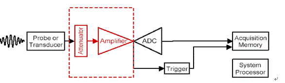 数字示波器的工作原理可以用图3 来描述,当输入被测信号从无源探头进入到数字示波器,首先通过的是示波器的前置放大模块,由于后续的A/D模数转换器对其测量电压有一个规定的量程范围,所以,示波器的前置放大模块就是负责对输入信号的预先处理,放大或者衰减到一定合适的幅度,然后才进入ADC。A/D模数转换器将输入信号转换为二进制数据,传送给存储模块。因为处理器的速度跟不上高速A/D模数转换器的转换速度,所以在两者之间需要添加一个高速缓存器。图2.2.1中还有一个触发电路,触发电路用来设定触发事件,只有当输入信号满足用户设定的触发事件时,示波器才会采集数据,这部分工作也可以在软件上实现。