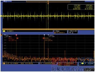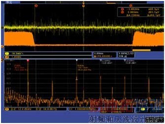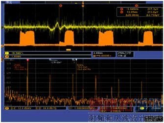 由此图上半部分时域波形中的橙色曲线,我们可以看到明显地发现射频输入的幅度呈周期性变化的规律。在此图中,表示频谱时间段的橙色条位于较宽的突发处,下半部分频谱图显示频率峰间隔约300KHz,说明此刻EMI与一个100KHz时钟有关。我们将频谱分析时间段移动到带有台阶的突发较窄段,得到如下结果: