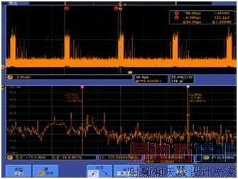 由于该电路板EMI呈周期性变化,既然FPGA的设计难以在短时间内更改,我们能否通过有效的控制手段,让有用的射频信号在突发周期间隔中底噪较低的时刻发射,而在突发幅度时刻不发射有用信息?客户认为此方法可行。底噪呈周期性变化,必定与电路板中某种控制信号相关,虽然我们已经测试出突发底噪变化的周期,但如果我们不知道这种周期与哪种控制相关,上述设想就难以实现。客户对其内部控制时序相当熟悉,94uS的周期刚好是该电路板高速USB信号传输控制周期。为了验证这一假设,我们将MDO示波器通道1接到高速USB控制测试点,同时测试射频频谱,得到如下结果: