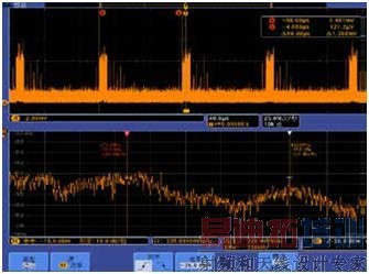 对于幅度随时间变化的频谱,MDO的优势在于调制域分析,为此我们打开MDO幅度随时间变化曲线显示功能,用MDO射频功率触发得到如下测试结果: