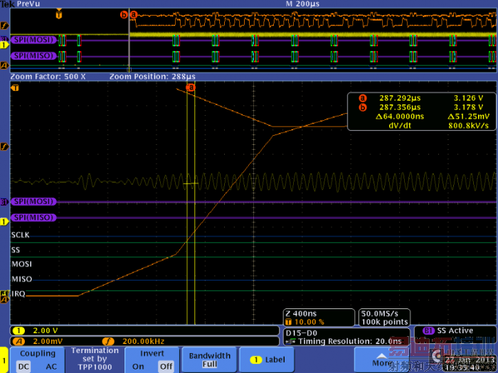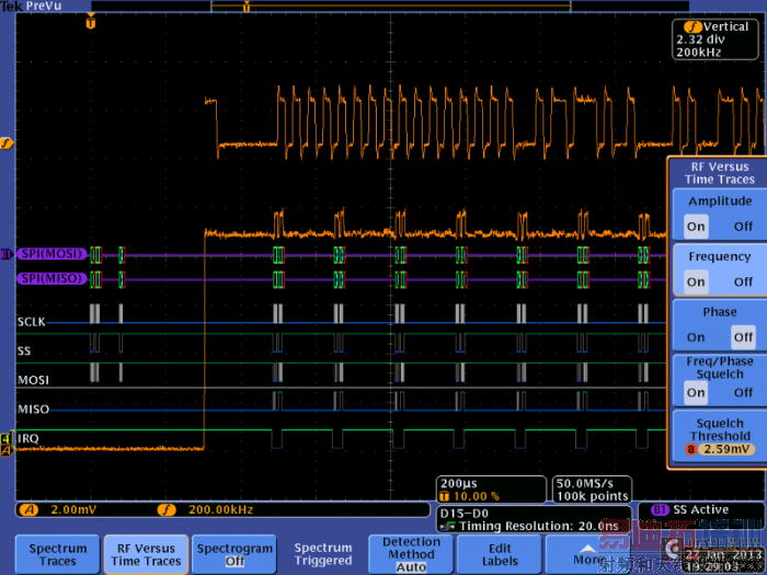 标着A的橙色轨迹是RF幅度随时间变化,是用连接到频谱分析仪输入上的简单天线捕获到的。SPI总线使用数字逻辑通道探测,在发送的SPI总线命令上触发了单次采集。由于这是FSK频移键控,在理想情况下,RF幅度应该不变。但我们可以看到,实际情况并不是这样。下面,我们增加了频率随时间变化轨迹,标为F: