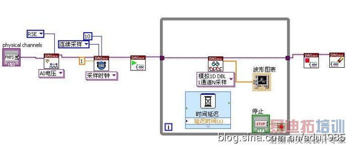 如果是这样的话,循环就连续执行,并不像有限采样那样,等到采够了所需的点数再进行读取显示,而是不停地读取显示。这就是与有限采样的不同。因此需要在while循环中,增加延时函数,在延迟结束时读取缓存区内的数据。