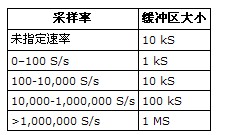 如采样模式为连续采样(定时函数/VI上的采样模式设置为连续采样),NI-DAQmx将划分出一块缓冲区,大小与每通道采样数属性相等,除非缓冲区大小的值比小表所列的值更小。如每通道采样数属性的值小于下表所列的值,NI-DAQmx将使用下表中的值。