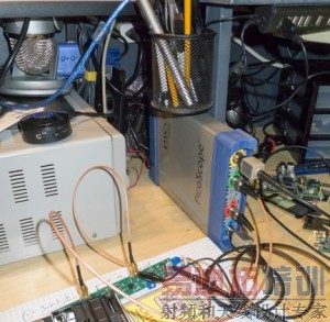 这是两种不同的设备类型,可根据需要去选择示波器的类型。很多人喜欢用台式示波器,因为它可以直接放在试验台上测试电路信号,而不需要配置一台电脑才能使用。也有人喜欢PC示波器,通过USB来连接到电脑上使用。我一直以来都比较喜欢于PC示波器。首先是它只需要占用很小的地方,例如,我可以将示波器垂直地放在桌子,这样就可以节省了一些地方(如图1所示)。