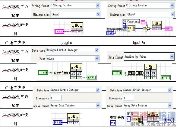 DLL和LabVIEW之间传递参数,最常用的三种数据类型是数值、数值型数组和字符串。C语言中经常把指针或者数据的地址在函数间传递,在32位操作系统中,可以使用int32数值来表示指针。因此,当需要在LabVIEW中传递指针数据时,可以使用I32或U32数值类型来表示这个地址类型的数据。但是,64位的程序中,数据的地址只能使用I64或U64来表示。这样,如果一个调用了DLL函数的VI,并且函数参数中有地址型数据,使用固定数据类型的数值来表示地址,就要准备两份代码。解决方法是使用LabVIEW中的新的数据类型Pointer-sized Integer。这个数据类型的长度在不同的平台上会自动使用32位或64位长度。如果在C语言函数参数声明中有const关键字,可以选中Constant选项。布尔类型在DLL函数和LabVIEW VI之间传递没有专有的数据类型,是利用数值类型来传递的。输入时先把布尔值转变为数值,在传递给DLL函数;输出时再把数值转为布尔值。对于数组的传递,LabVIEW只支持C数据类型中的数值型数组,传递数组类型需要注意的的是“Array Format”要选择“Array Data Pointer”。这个设置中还有其他两个选项,带有“Handle”的参数类型都是表示LabVIEW定义的特殊类型的。在第三方的DLL中不会使用到数组参数作为输出值时,要记得为输出的数组数开辟空间。开辟数据空间的方法有两种:第一种方法,创建一个长度满足要求的数组,作为初始值传递给参数,输出数的数据就会被放置在输入数组的所在的内存空间内。第二种方法是直接在参数配置面板上进行设置。在Minimum size中写入一个固定的数值,LabVIEW就会按此大小为输出的数组开辟空间。在 Minimum size 中选择函数的其它数值参数,而不是固定数值。这样LabVIEW会按照当时被选择的参数值的大小来开辟空间。字符串与使用与数组是非常类似的,实际上在C语言中字符串就是一个I8数组。