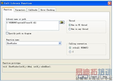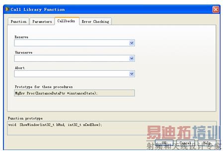 如果为Reserve选择了一个回调函数,那么当一个新的线程开始调用这个DLL时,这个回调函数首先被调用。可以利用这个函数为新线程使用到的数据做初始化工作。线程在使用完这个DLL之后,它会去调用Unreserve中指定的回调函数。Abort中指定的函数用于VI非正常结束时被调用,也就是让一个程序在运行完前停止。这些回调函数的原型在Prototype for these procedures中列出,必须要由DLL的开发者按照特定的格式实现。如果使用的DLL不是专为LabVIEW设计的,一般不会包含这样的回调函数。