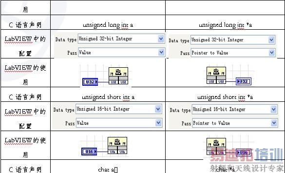 在NI软件的安装路径下打开当前使用版本的LabVIEW文件夹,通过 examplesdlldata passingCall NativeCode.llb找到简单数据类型在LabVIEW与C之间的对应关系。部分常见关系见表1。