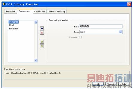 如果是C语言等非LabVIEW生成的DLL函数,需要将retuen type的type选项和Data type选项改成函数定义的参数类型,对于函数里输入的参数也都需要自行添加。Callbacks和Error Checking则不需要改动。