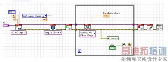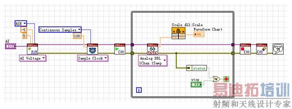 点击“OK”,将生成的CLN的输入段连接到DAQmx Read.vi,return type输出连接到波形图表上,即可实现采集值放大10倍的功能。
