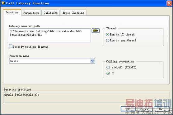 在程序框图放入Call Library Function Node,双击弹出对话框。在Function页面的Library name or path中给入生成的Scale.dll文件的路径,Function name选择Scale,其他选项默认。